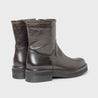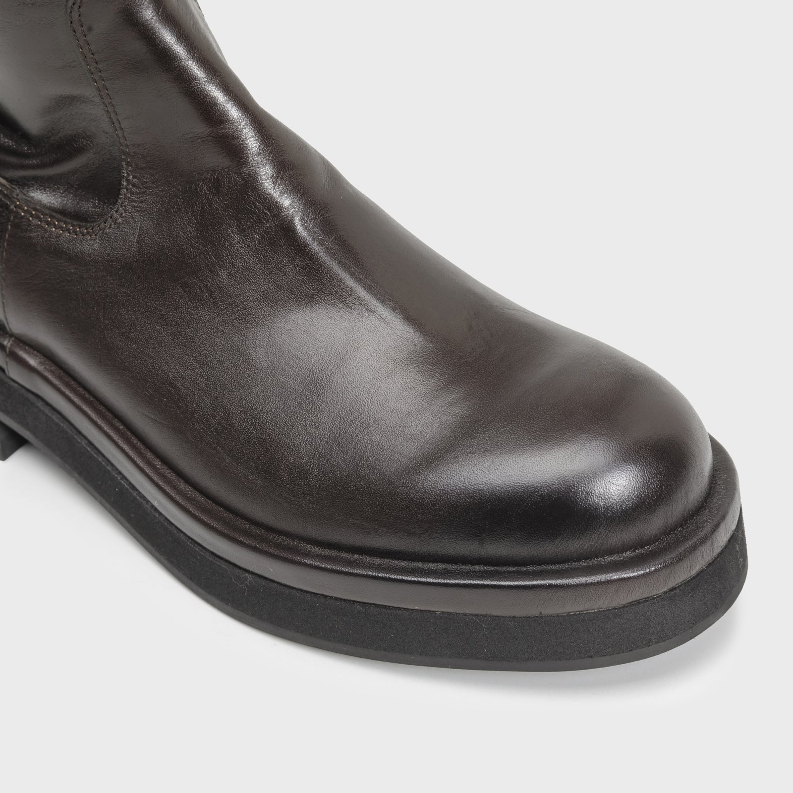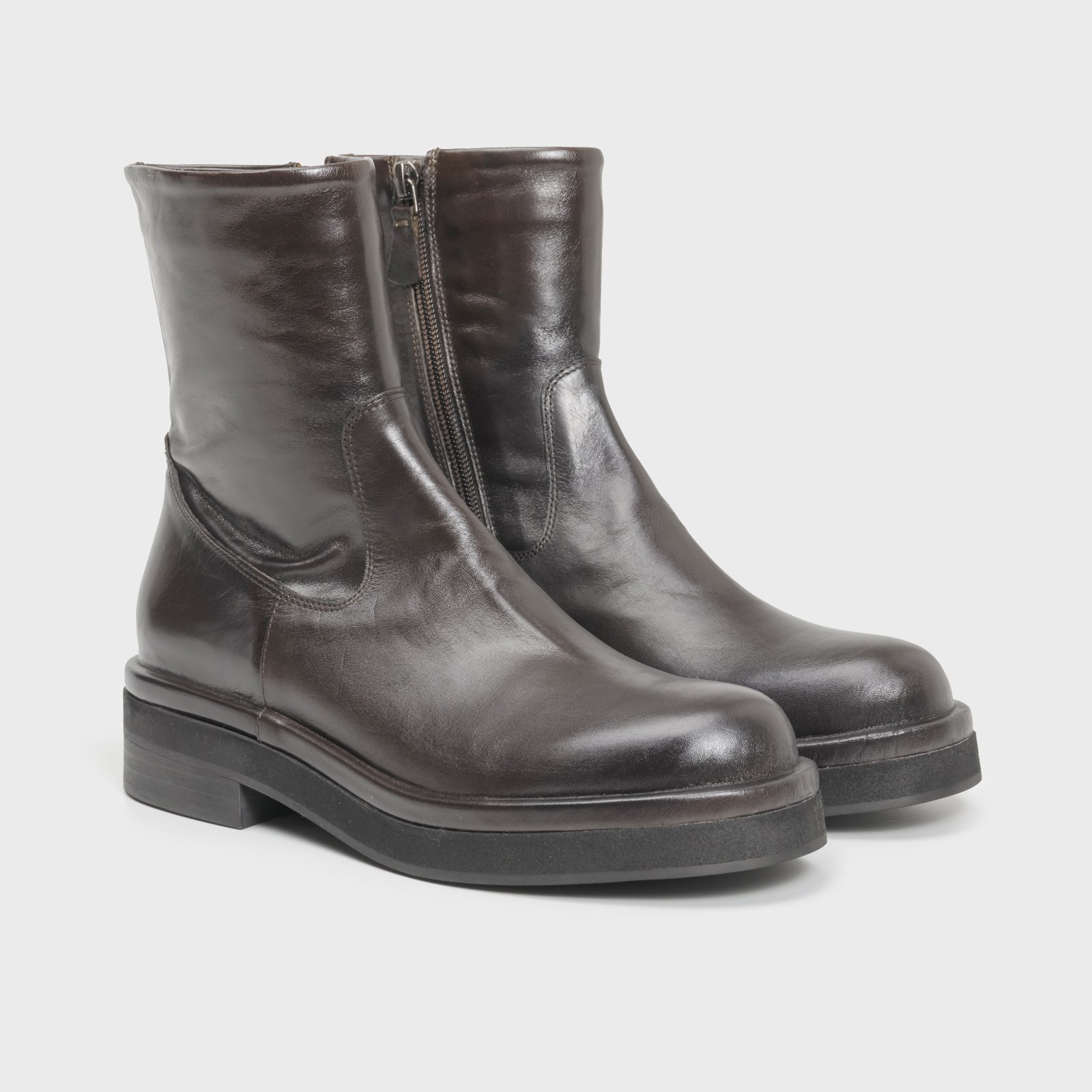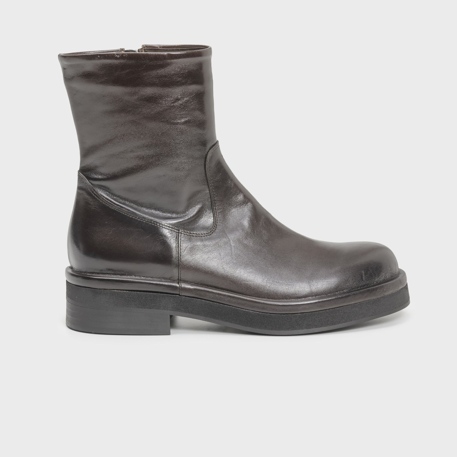 An essential and contemporary design characterizes these ankle boots. The shiny dark brown leather and the contrasting platform sole create a bold and versatile silhouette. This footwear is an essential accessory for a casual yet modern look.