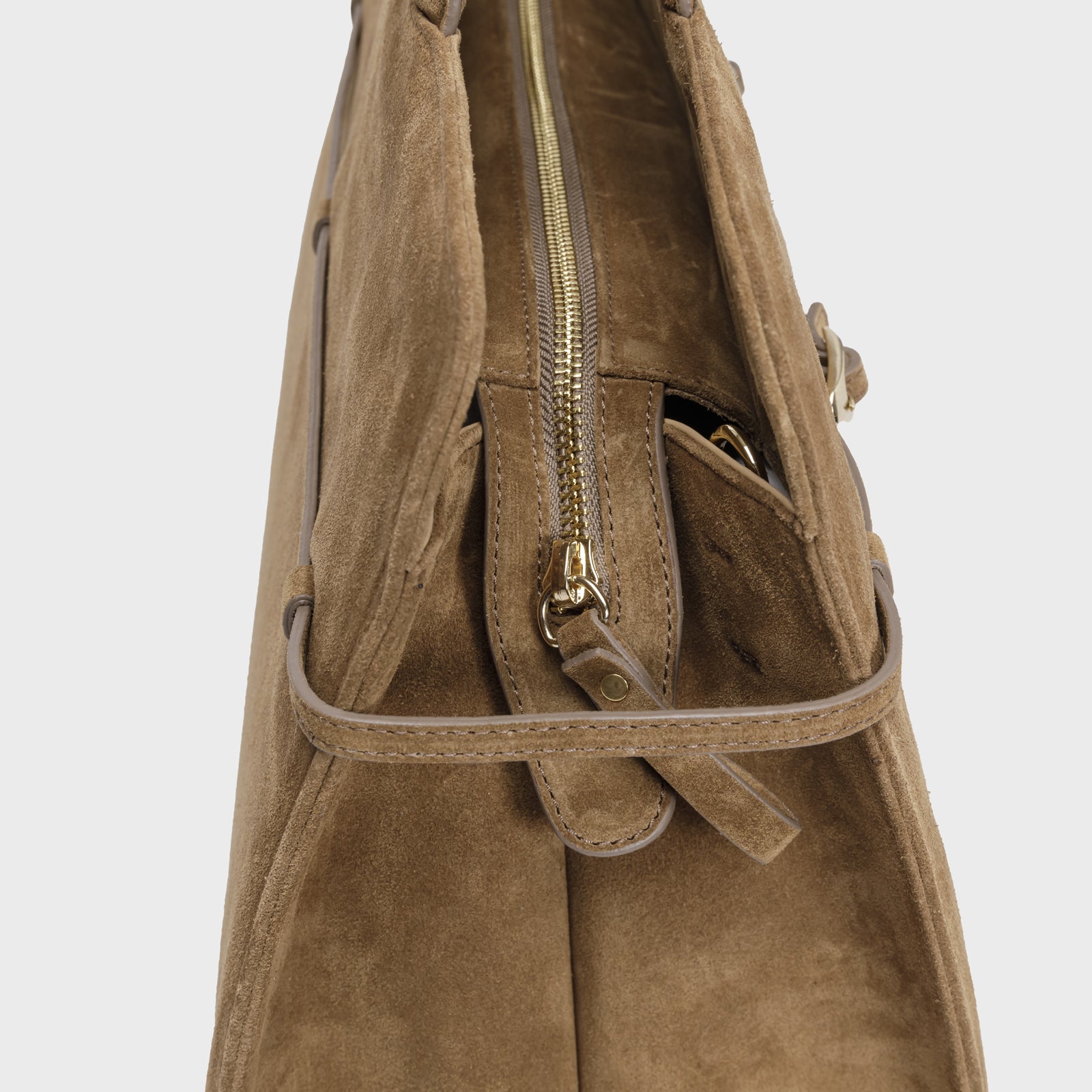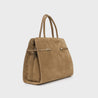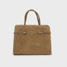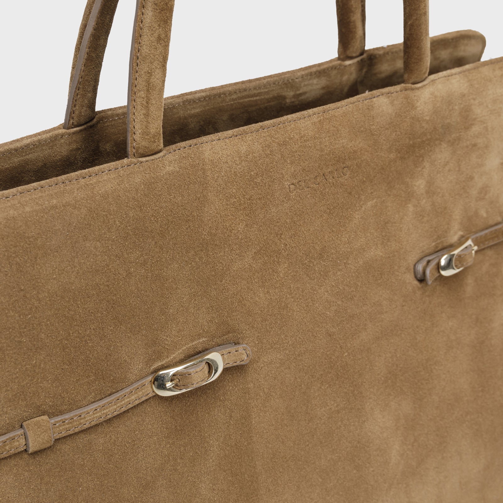 This Del Carlo handbag is crafted in brown suede. The tone-on-tone leather-covered handle and two straps with gold metal details make the linear, geometric design of this bag a must-have accessory.