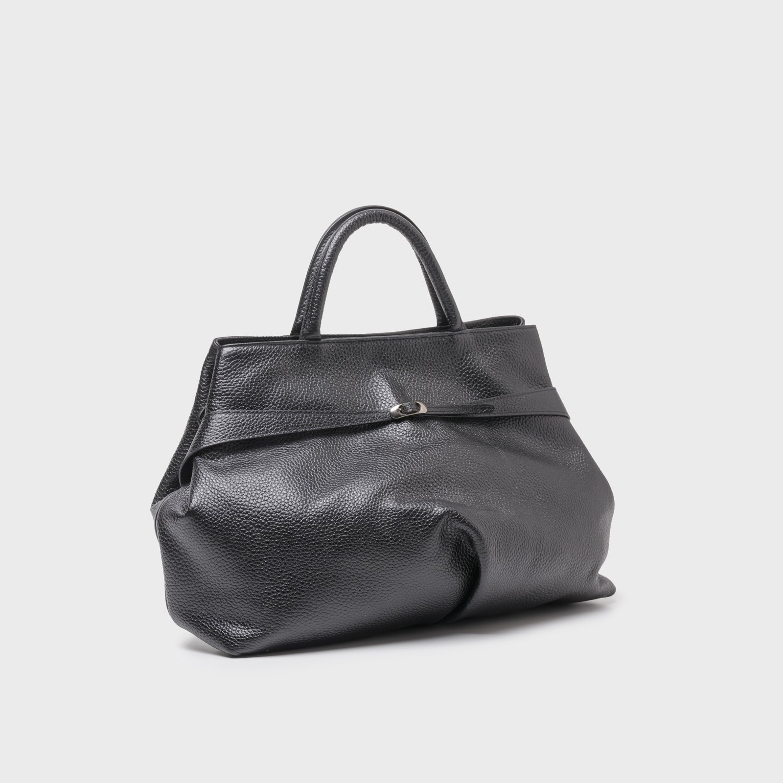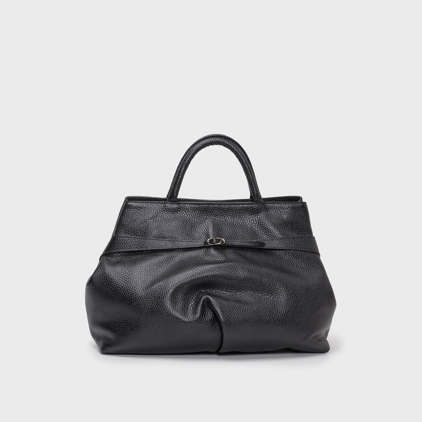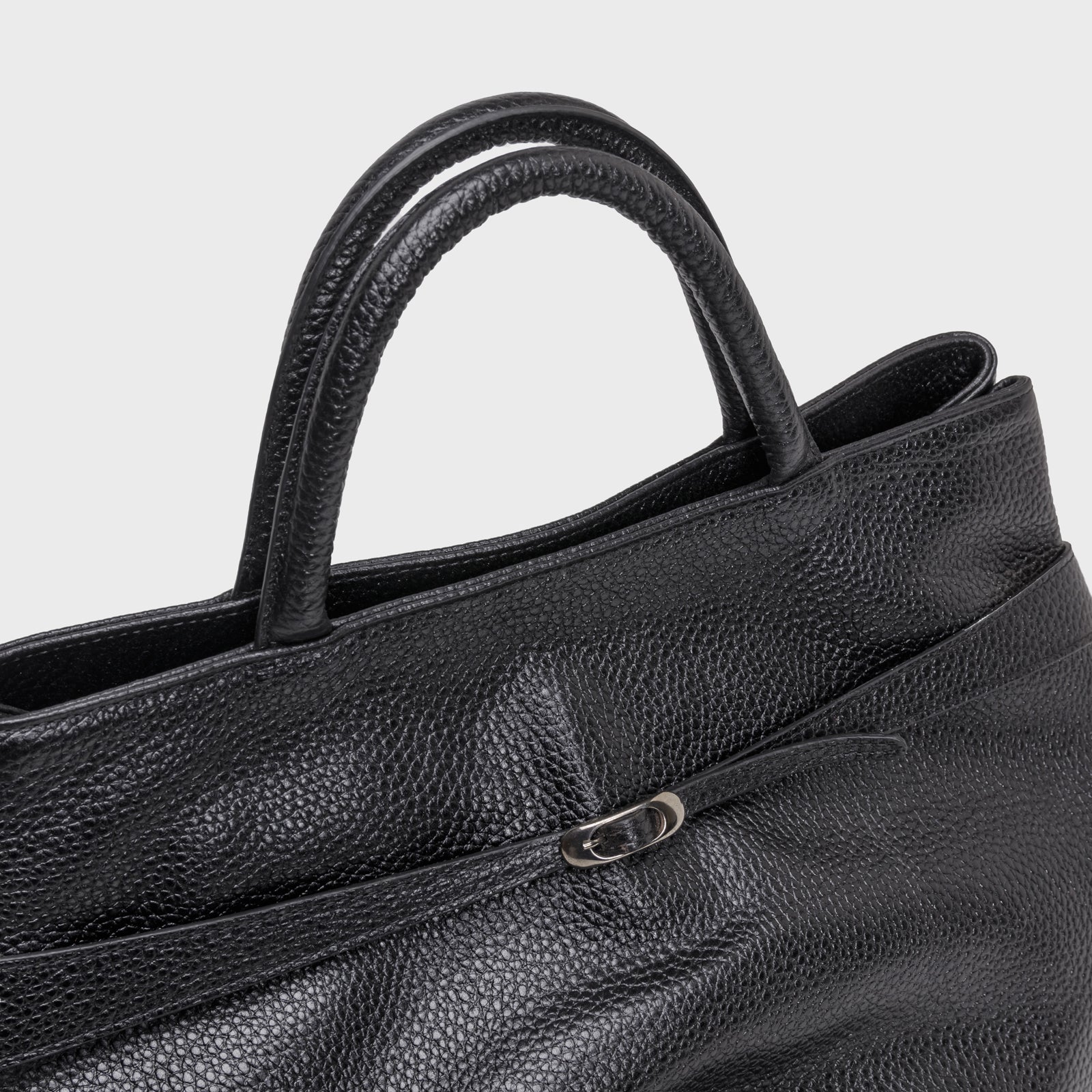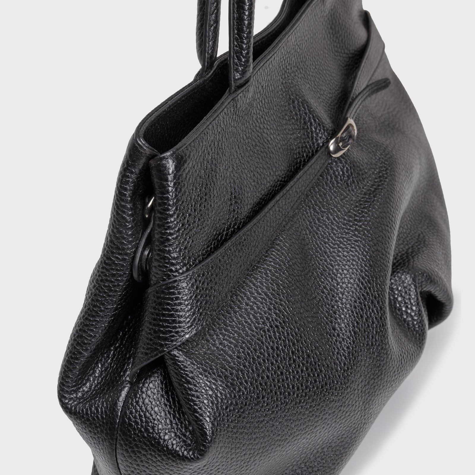 Versatility and sophistication meet refined materials such as black leather for a bag that is perfect to carry 24/7. Equipped with an adjustable shoulder strap, it can be worn cross-body or by hand to adapt to any occasion.
