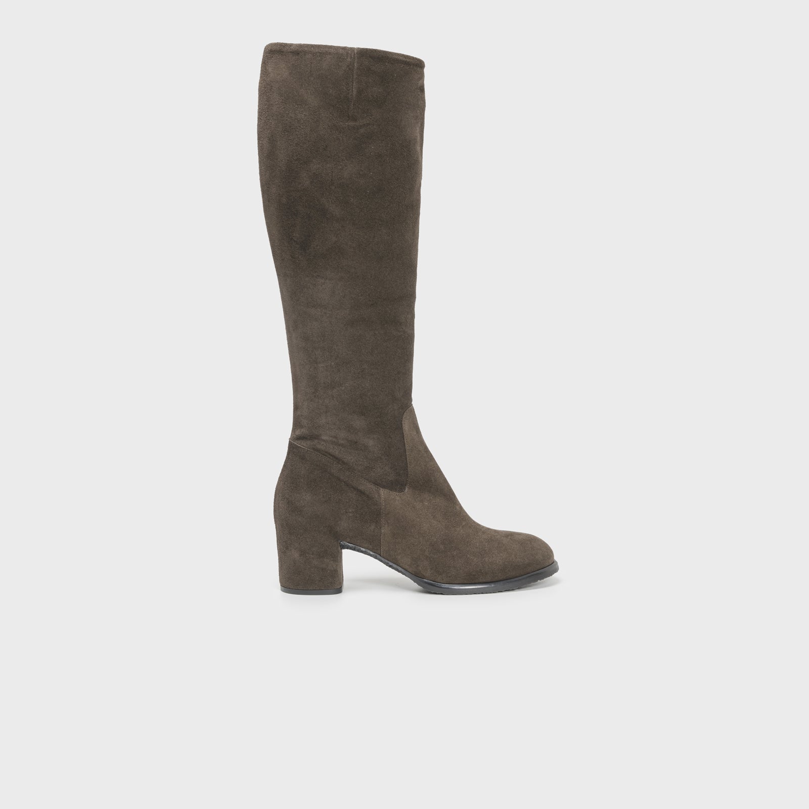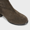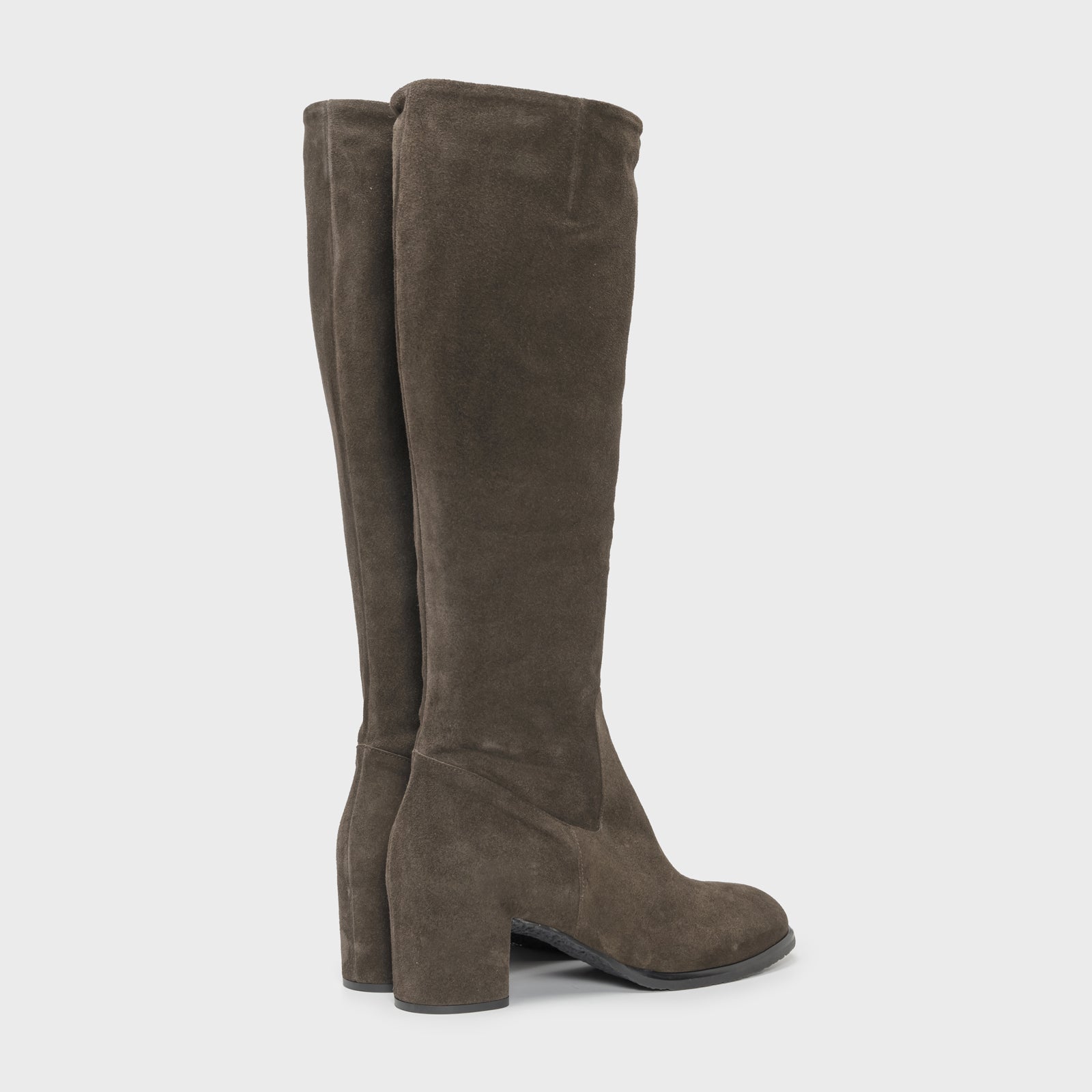 Questo stivale, realizzato in suede marrone scuro, si distingue per la sua silhouette slanciata. Il tacco a blocco conferisce una struttura audace, rendendo la calzatura un accessorio di carattere, perfetto per affrontare la stagione più fredda con stile.