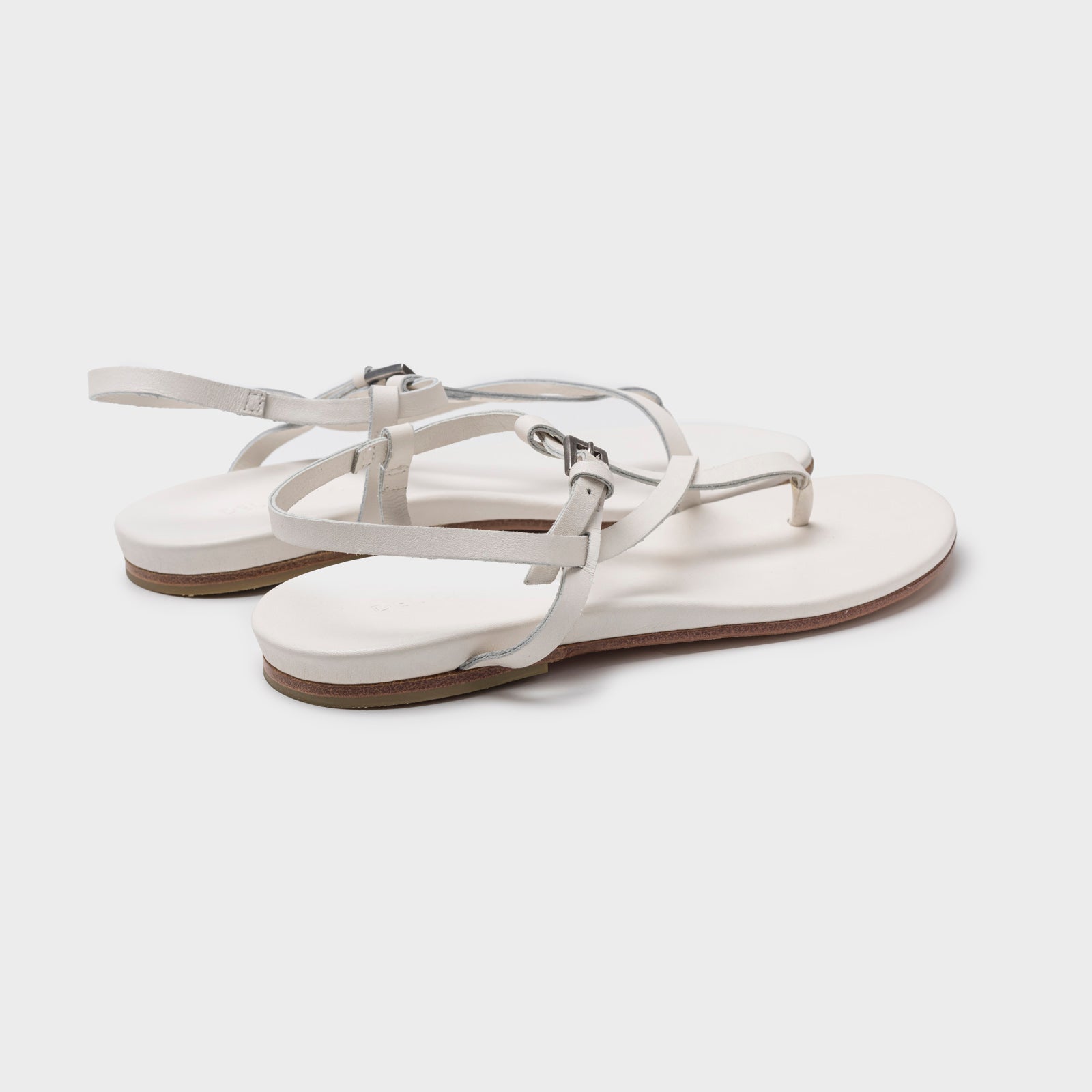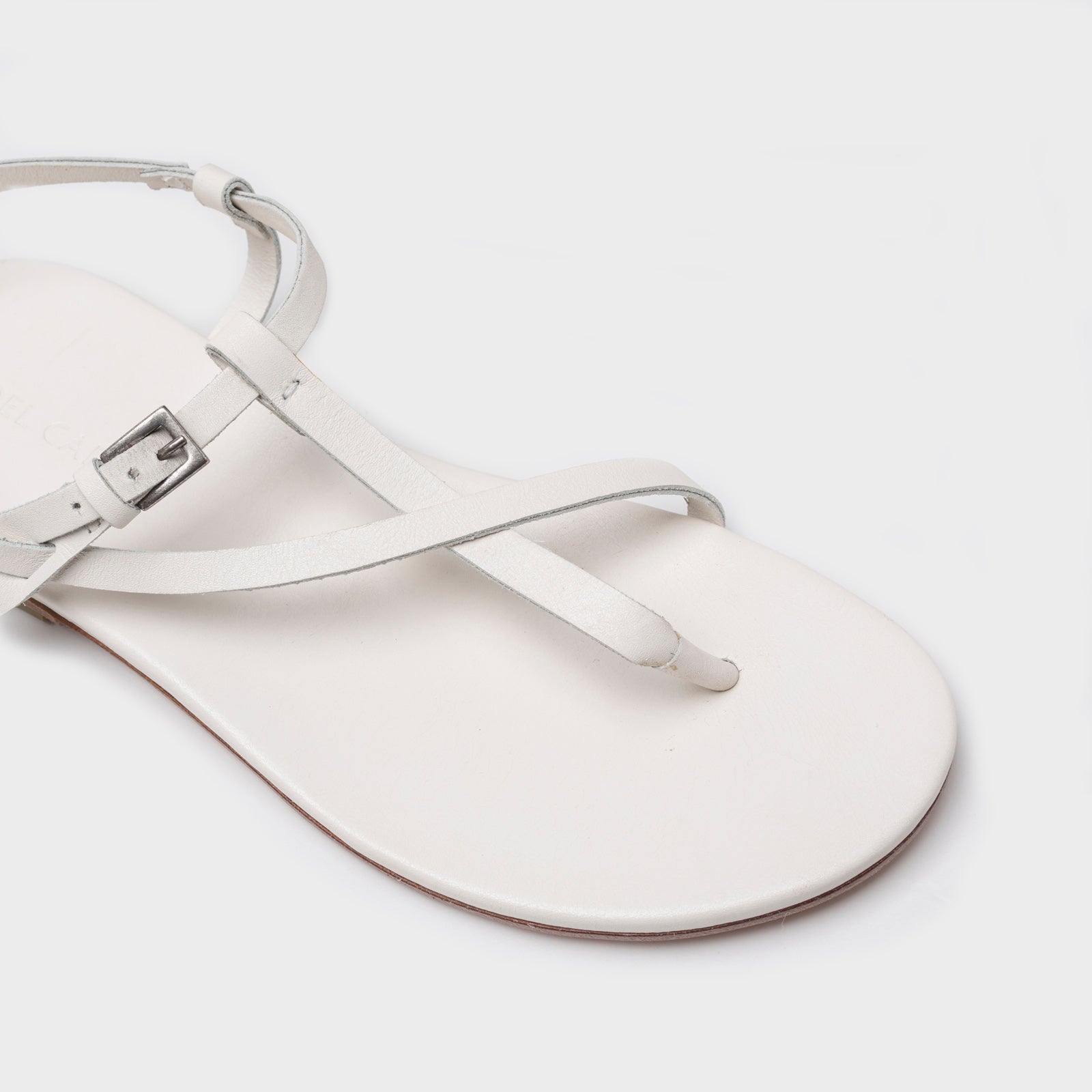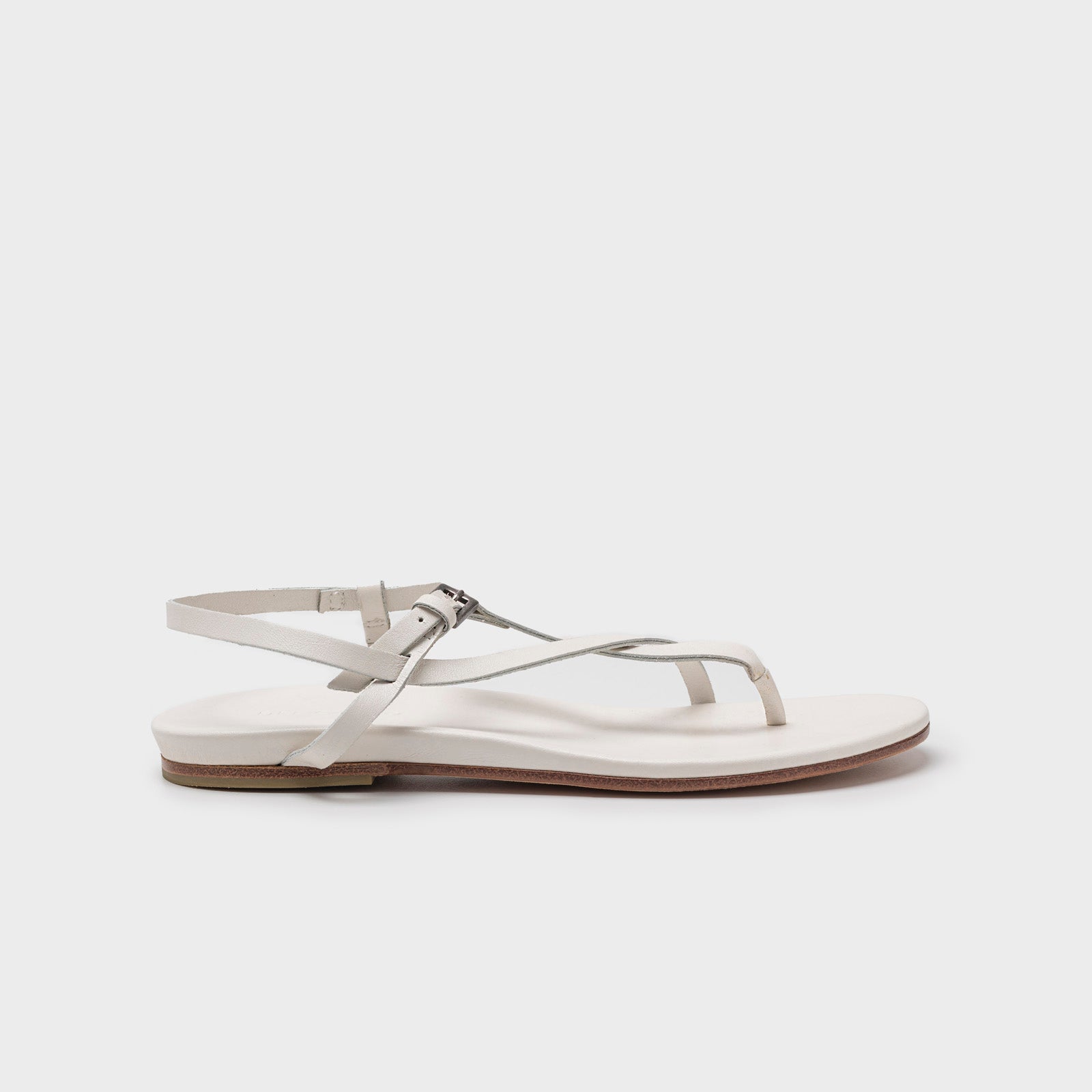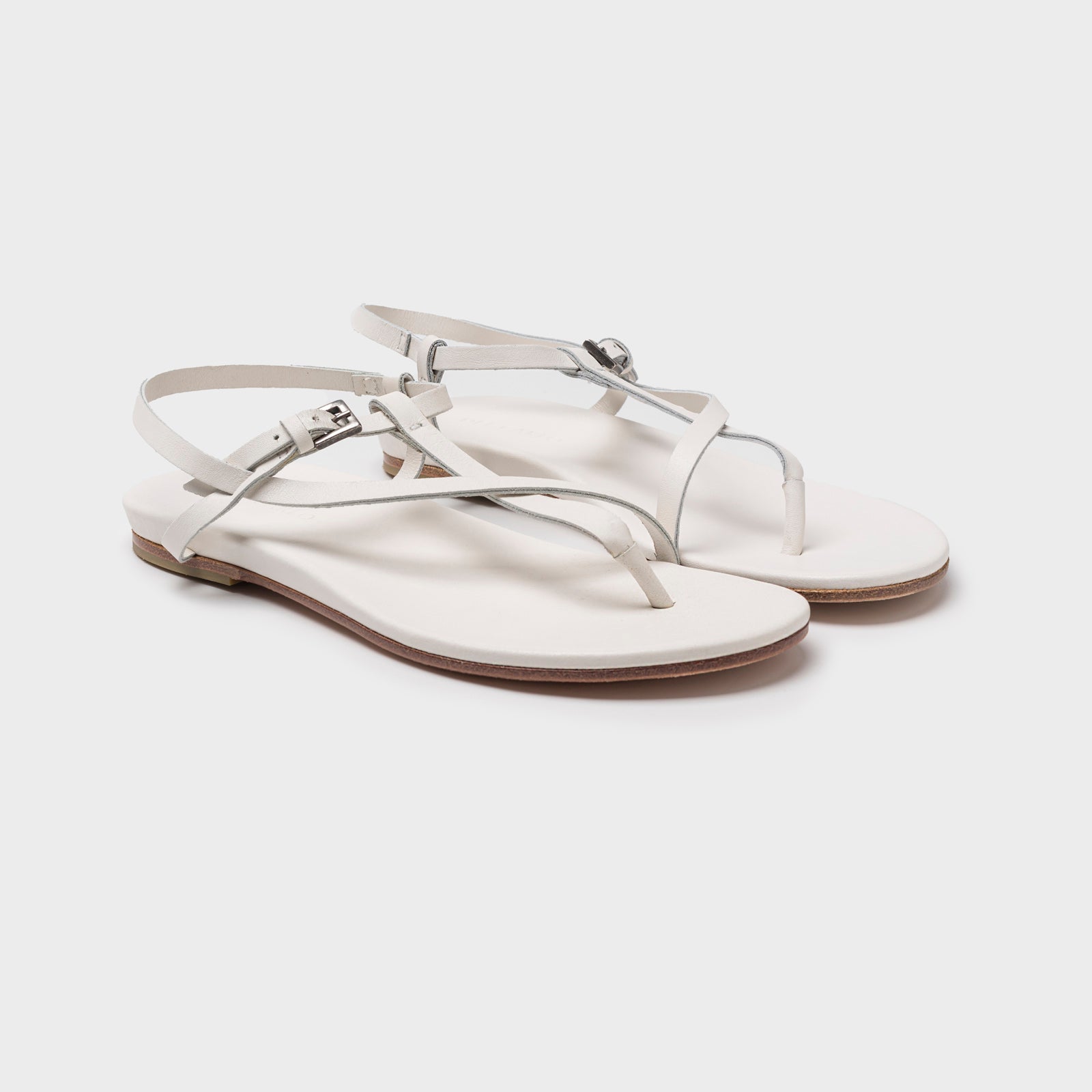 Feminine and sophisticated lines characterize this flat sandal in raw cut leather in white. The strap elegantly wraps the ankle and makes this shoe a precious accessory.