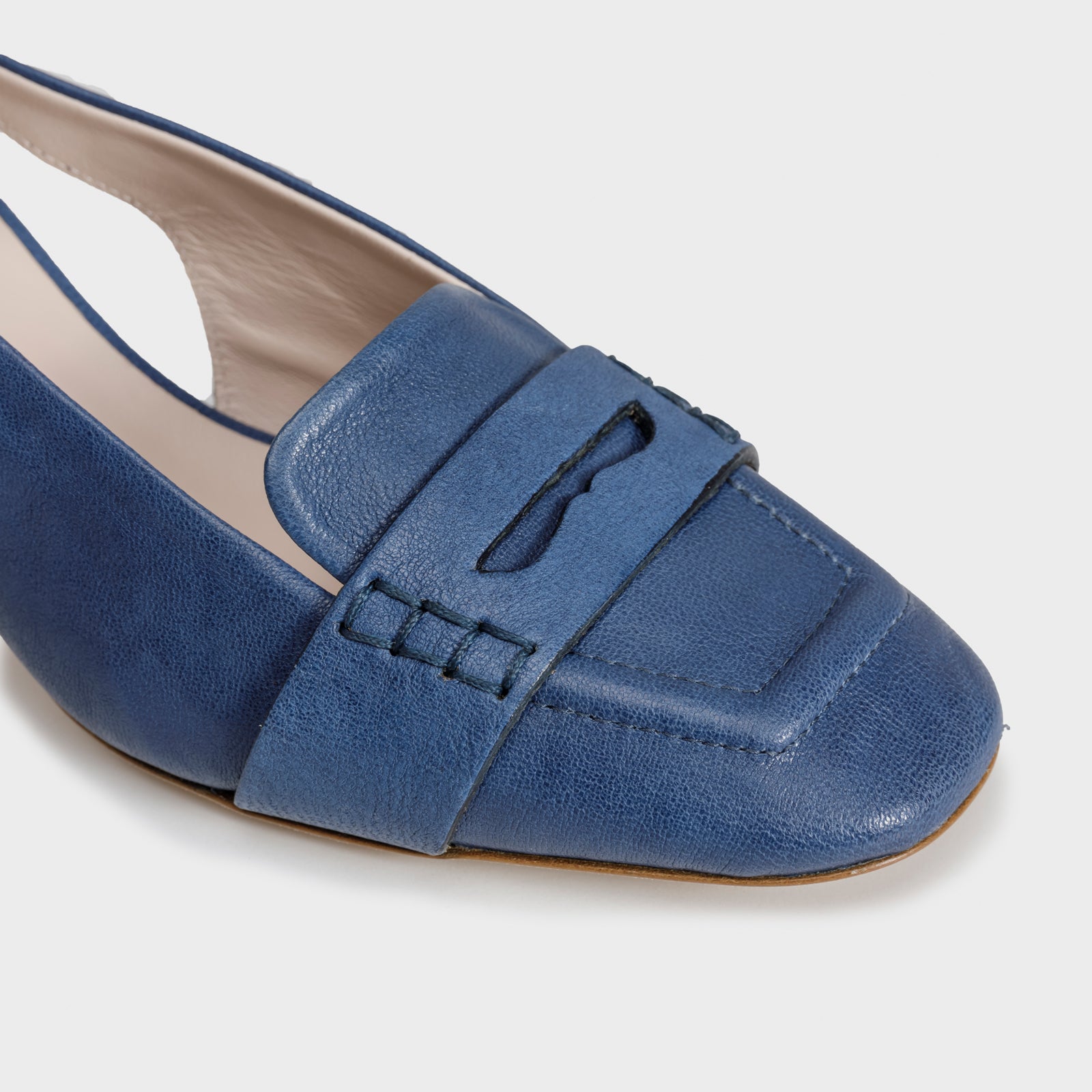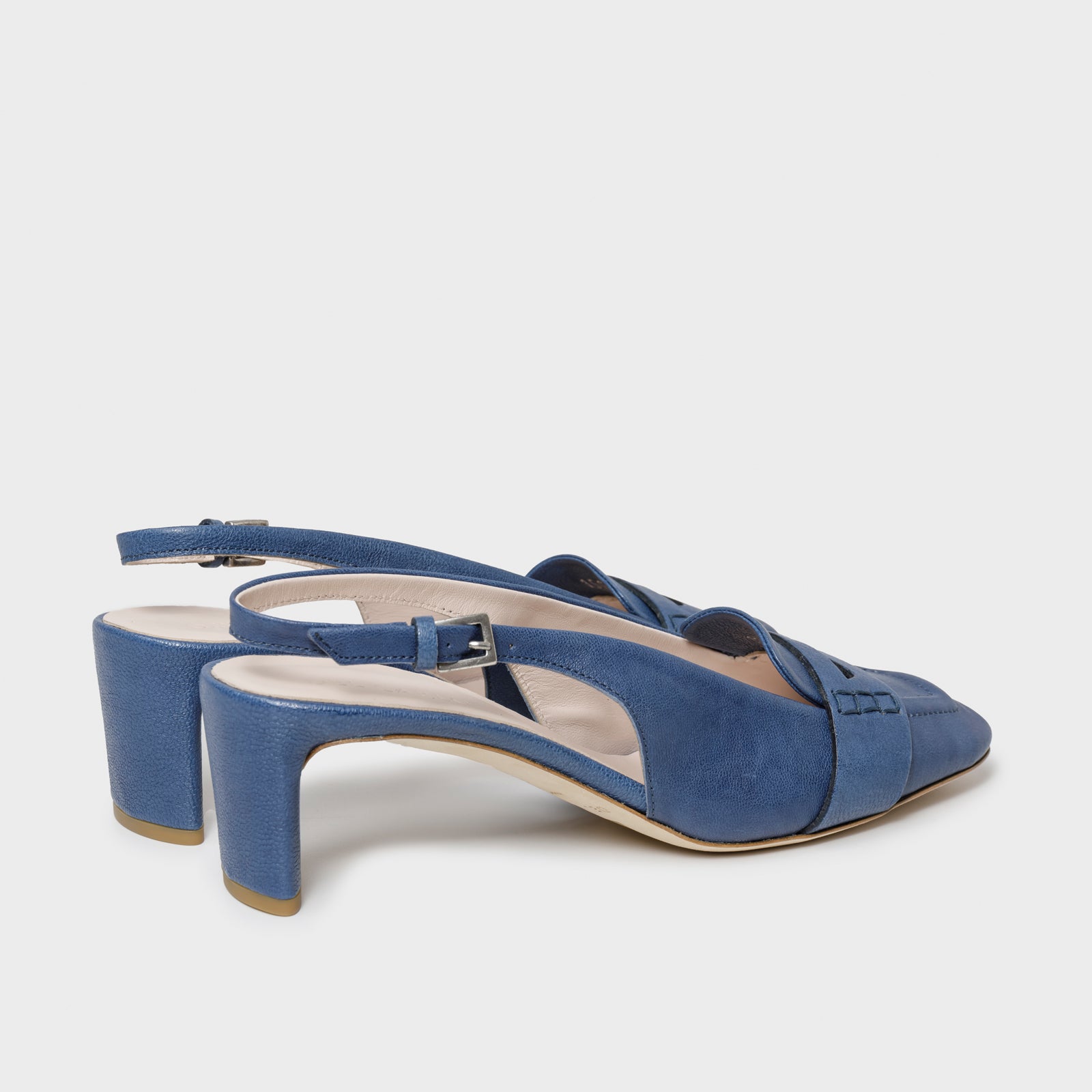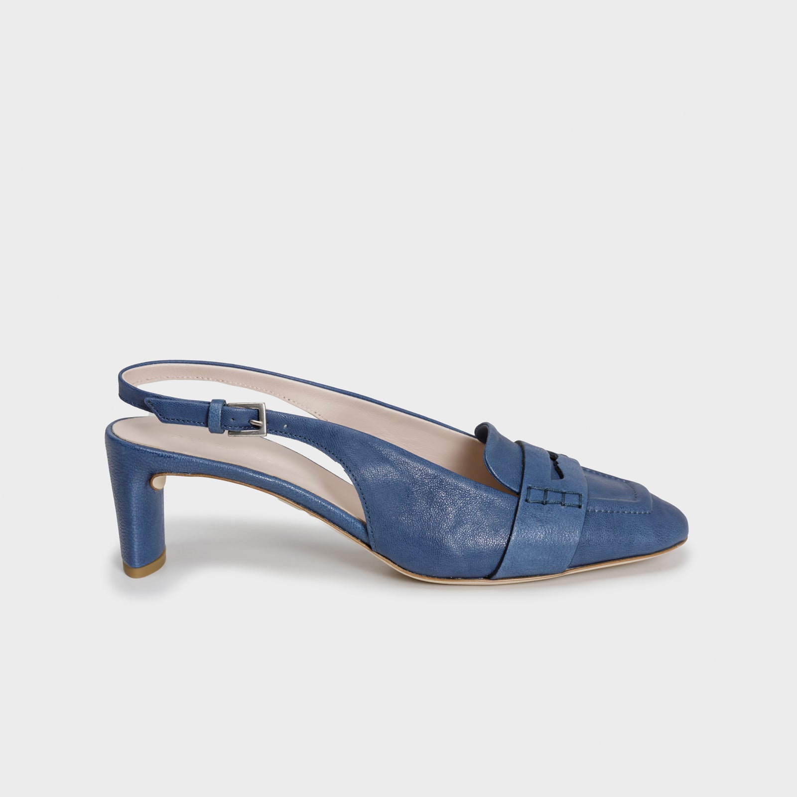 Blue nuance for the mid-heel pump slingback, made of soft leather. These shoes harmoniously integrate the elegant design of a shoe with the timeless allure of a loafer thanks to the detail on the upper.