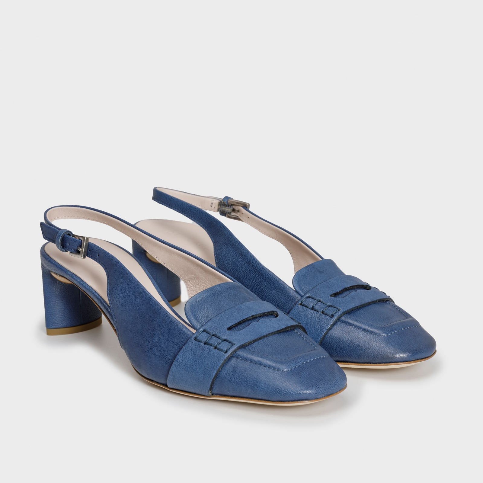 Nuance jeans per le pump slingback dal tacco midi, realizzate in morbida pelle. Integrano armoniosamente il design elegante di una scarpa con il tacco a quello senza tempo di un mocassino grazie al dettaglio sulla tomaia.