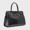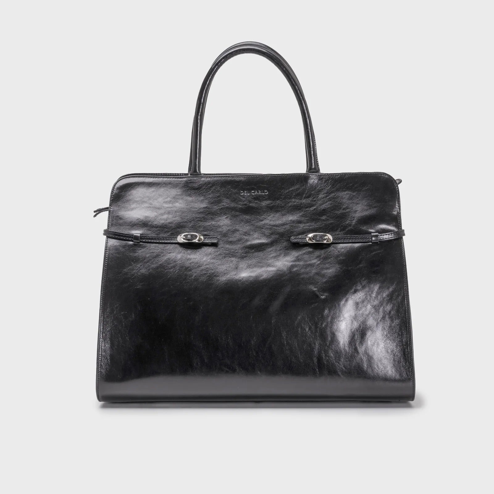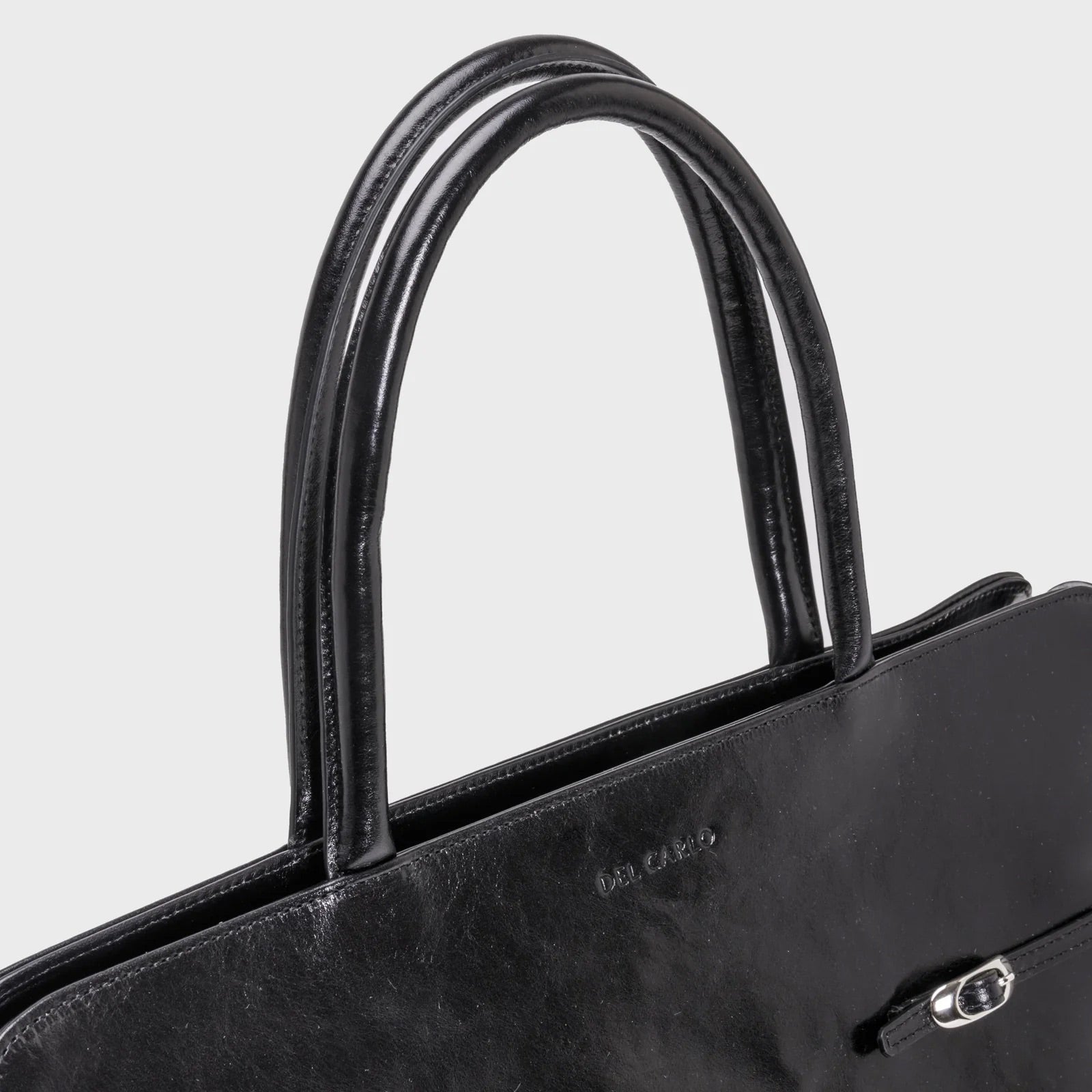 La borsa a mano in stile Del Carlo è realizzata in pelle color nero. Il manico ricoperto in pelle tono su tono e i due cinturini con dettagli metallici argentati rendono il design lineare e geometrico di questa borsa un accessorio irrinunciabile.